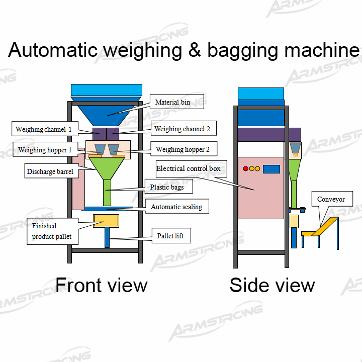 The automatic weighing & bagging machine is composed of an automatic weighing structure, automatic weighing and feeding of raw materials, touch screen digital control, and a dual cage feeding servo unit, as well as a dual channel weighing part.