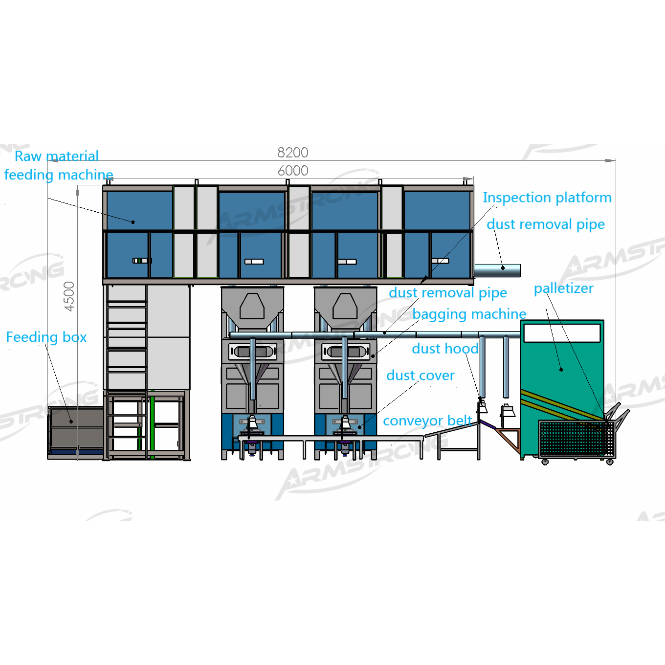 In order to reduce the labor intensity of workers, we has designed and produced multiple sets of CNC automatic weighing & bagging machines to automatically transport the bagged material to the entrance of the palletizer through the conveyor belt, and set relevant parameters according to the special software and manual through the automatic detection of equipment, exhaust, pressing and truss robots.